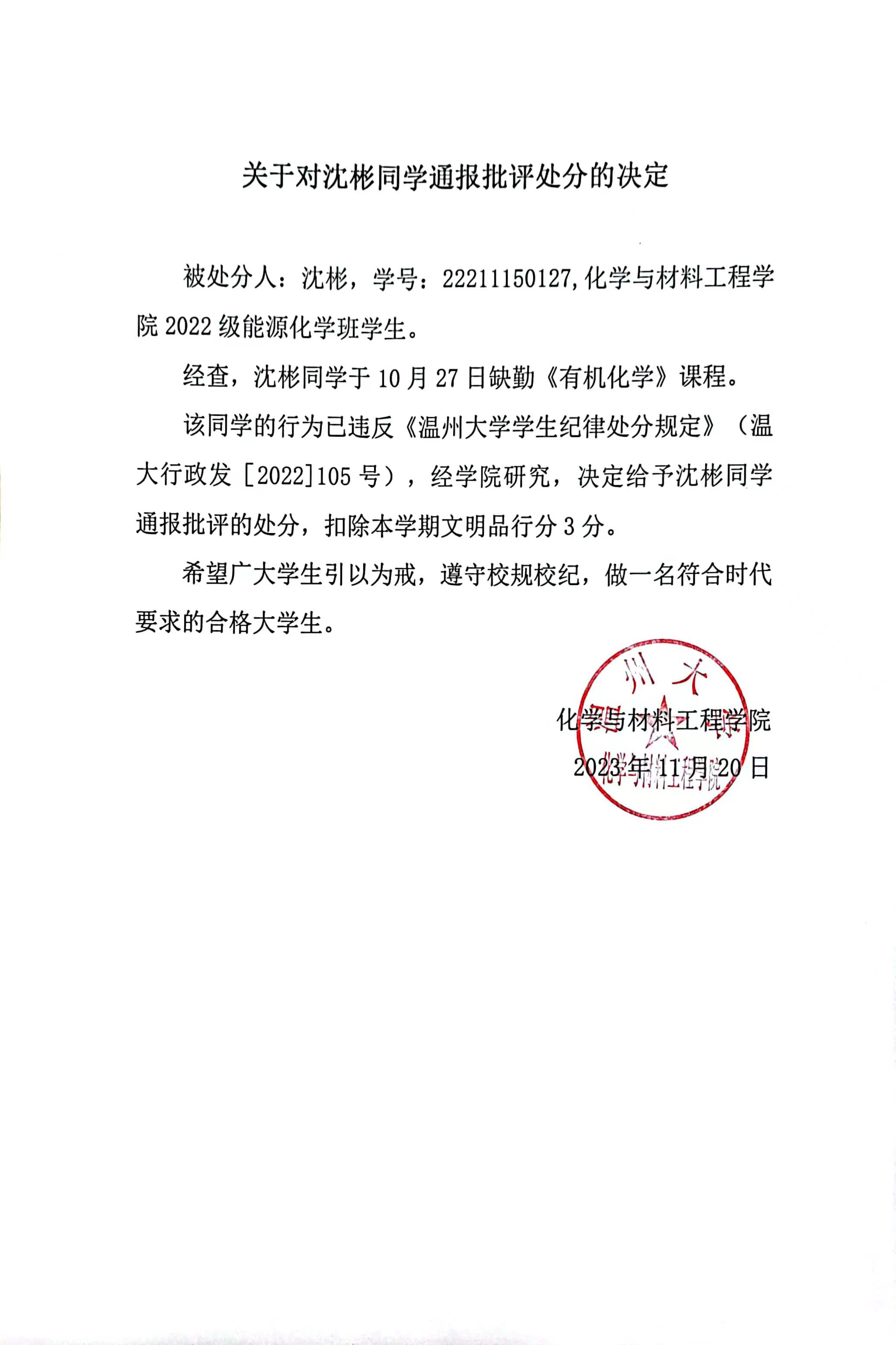 关于对沈彬同学通报批评的决定