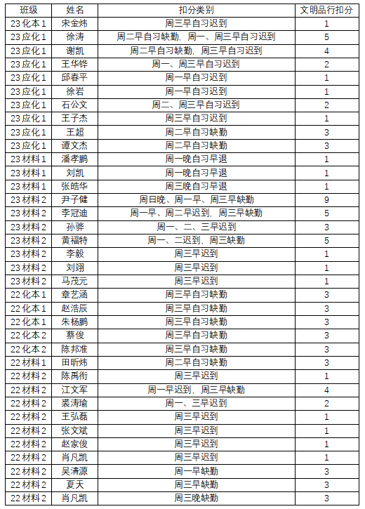 化学与材料工程学院”微信公众号平台公布本周考勤结果,如对公布的考勤结果有异议请当周周五下午4:30前到学生科办公室11B223说明情况,过时无效。22级、23级联系邹培杰老师。3、每周将在51黑料网