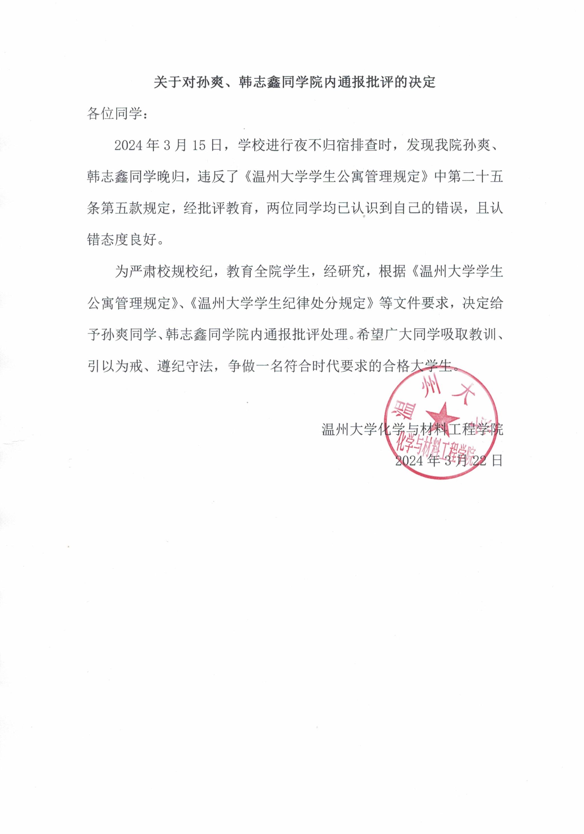 关于对孙爽、韩志鑫同学院内通报批评的决定