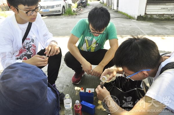 炎炎烈日,也没能阻挡我们调研小分队探索科学的步伐。首先到达的第一个地点是蒲兴路附近的蒲州河桥,调研组一位男生先是持着一根线抛下了一个瓶子,将捞上的满瓶水倒在实验需要的空瓶子里,重复两次。对河水的检测共需要测量五个指标,即COD、磷酸盐含量、溶解氧、氨氮含量和镉含量。四位调研组成员已经提前分配了不同指标的定量测量任务,各司其职,严谨认真。检测的第一步是洗涤,用准备的清水先将试管湿润洗净。第二步将河水沿试管内壁倒入其中。第三步,也是最重要的一步,将指示剂滴入几滴于同一支试管中,必要时充分振荡使其快速充分反应。第四步,将试剂拿起与相应的比色卡对比后读出数据,并且参考每位成员的读数,记录数据,尽可能地减小因读数引起的实验误差。由于一些特殊试剂有较强的腐蚀性或其他性质,实验过程中调研组的成员还需注意安全。每个指标测量完成后,都需要洗涤试管,将检测后的液体和实验过程中产生的废液都倒入一个瓶中,整理所有的试剂试管,收拾后起身前往下一个目的地。