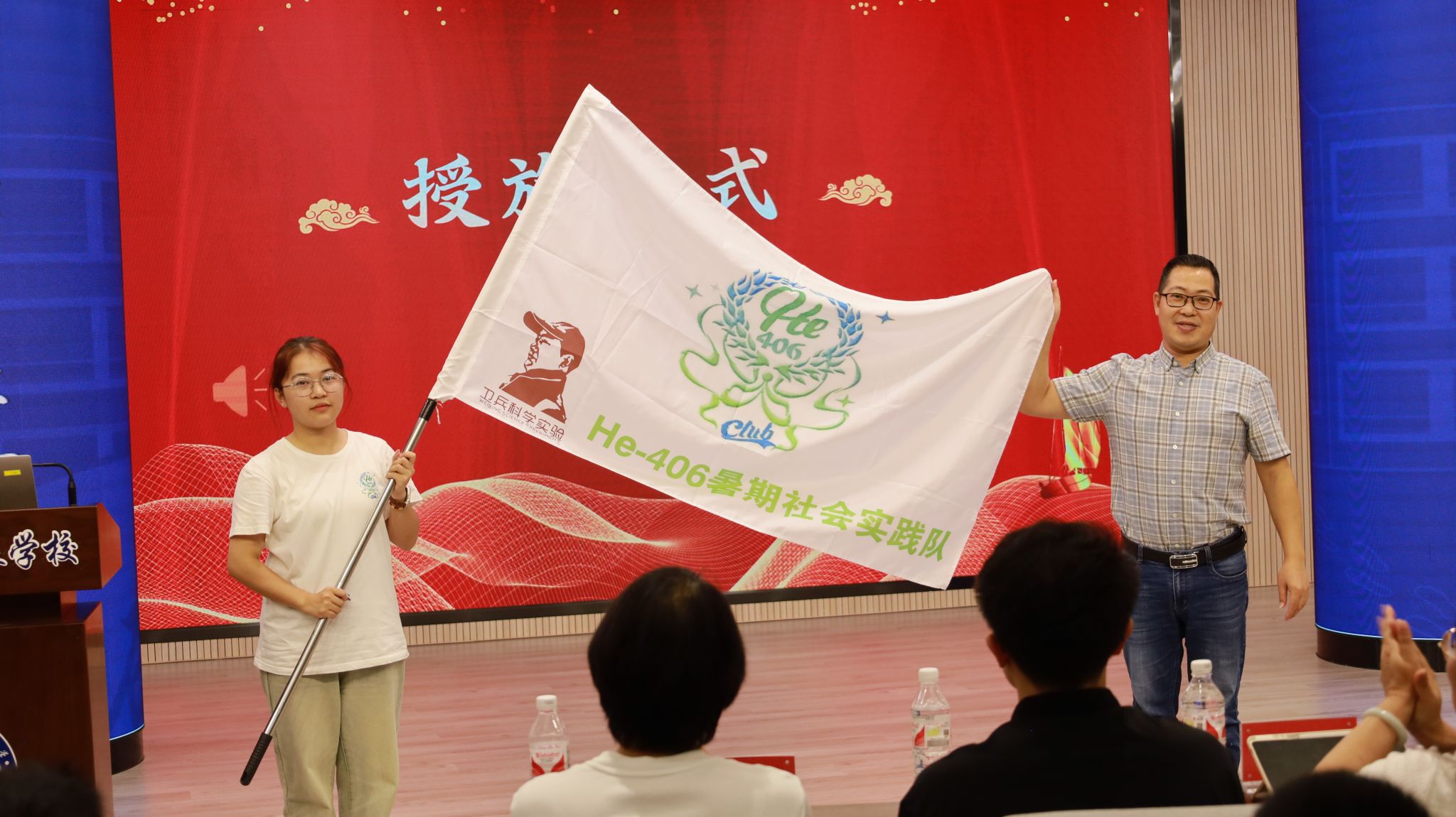 教工党支部书记刘妙昌为实践队颁授队旗,标志着实践活动的正式启动。