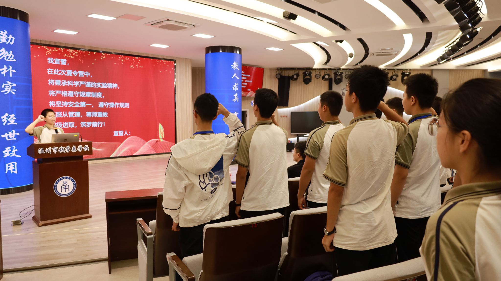 南浦实验中学学生代表胡同学介绍了自己在去年参加化学科普夏令营中的学习与经历,分享了个人的成长、收获以及参加本次夏令营的积极期待。胡同学在发言结束后,以营员代表的身份带领全体营员宣誓。通过宣誓,营员们进一步明确了自己在夏令营期间的学习目标和承诺。
