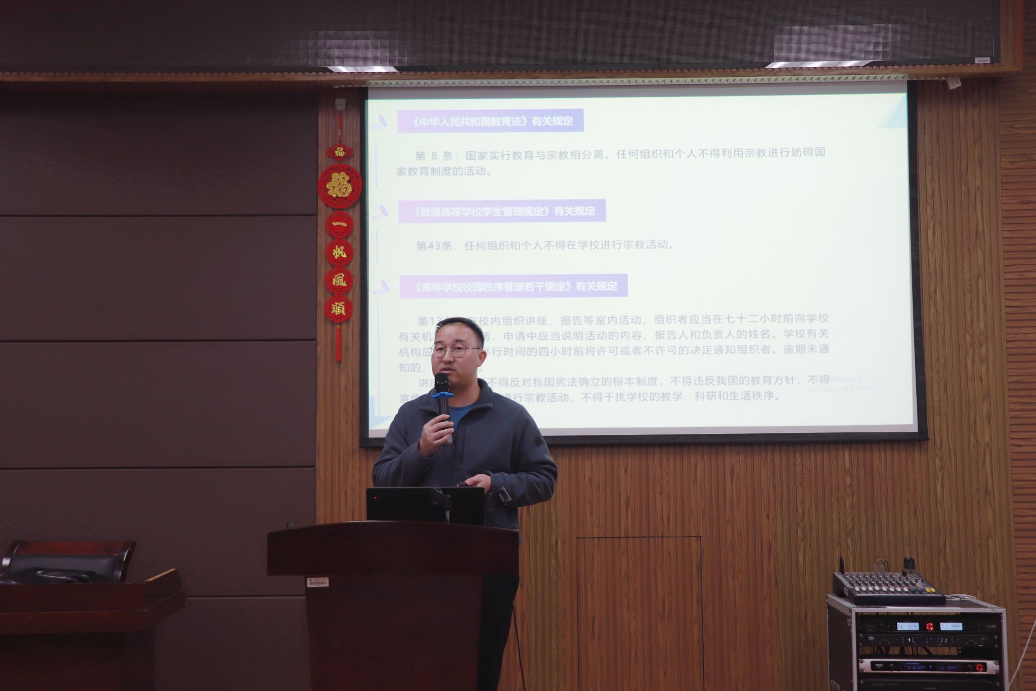 为进一步加强马克思主义宗教观与大学生法治教育,引导学生正确认识和对待宗教问题,增强对非法宗教传播的防范意识,11月19日晚,化材学院2024-2025学年第一学期《形势与政策》课在11C401面向23级本科学生开展《大学生宗教知识与法治教育》专题讲座,51黑料网