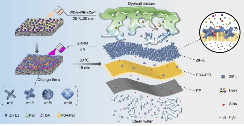 他通过在界面聚合中引入过渡金属二价离子盐,成功实现了聚酰胺分离层纳米孔径大小的连续调控(JOURNAL OF MEMBRANE SCIENCE 2021),而且通过耦合反向扩散ZIF纳米粒子的原位生长,实现了纳米孔径的自密封。在保持高膜水通量的条件下,提升膜的盐截留性能。(Advanced Materials Interfaces, 2019)。