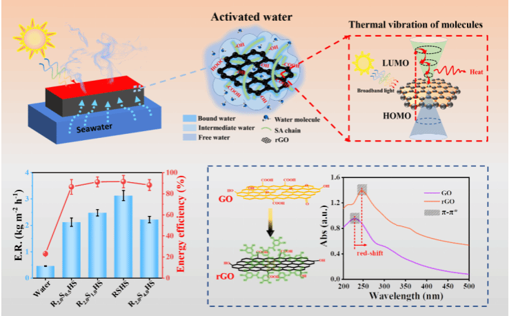 水由于氢键作用而被活化,蒸发焓被降低到1094.85 J g-1,在模拟太阳辐射(1000 W/m2)下,蒸发速率高达3.13 kg m-2 h-1(为二维蒸发器理论极限的2倍),能量转换效率为91.54%。