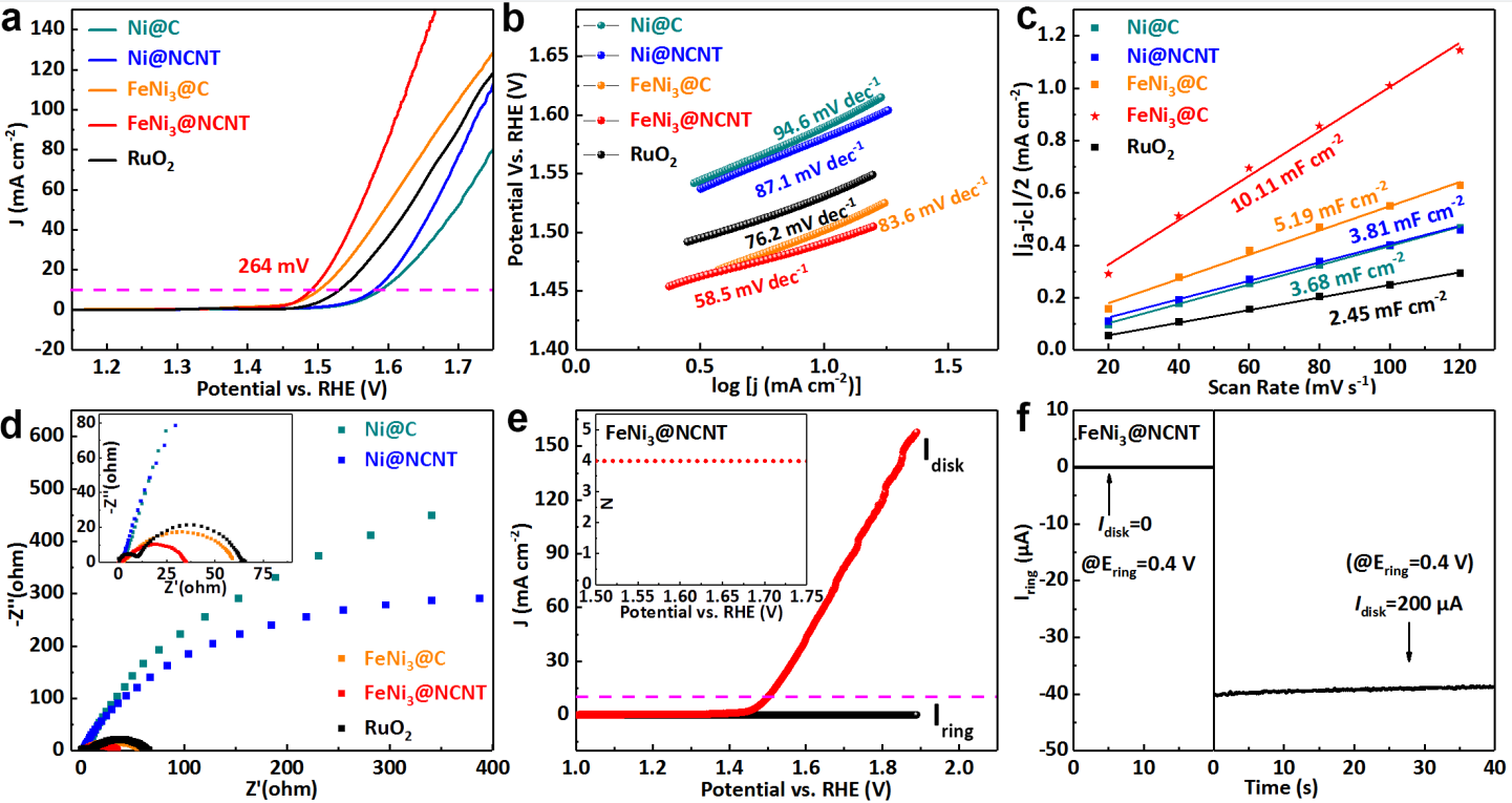 图7.MOF衍生碳材料和RuO2的(a)LSV曲线,(b)Tafel图,(c)Cdl值,(d)EIS图,(e)FeNi3@NCNT的RRDE伏安图和计算出的电子转移数N,(f)FeNi3@NCNT的环电流。