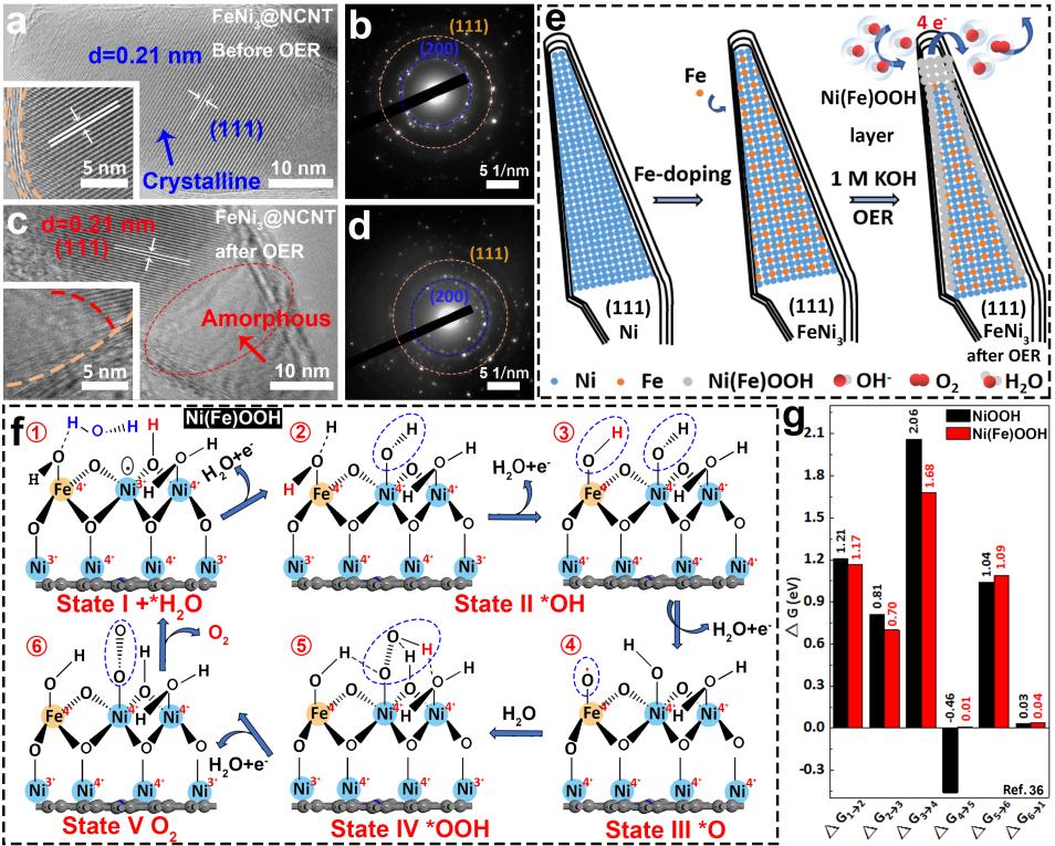 图8. FeNi3@NCNT在OER前后的(a、c)TEM和HR-TEM图像,(b/d)SAED图,(e)FeNi3 NPs在单分散多壁碳纳米管中用于OER的示意图,(f)Fe掺杂NiOOH的OER机理分析,(g)NiOOH和Ni(Fe)OOH的自由能。