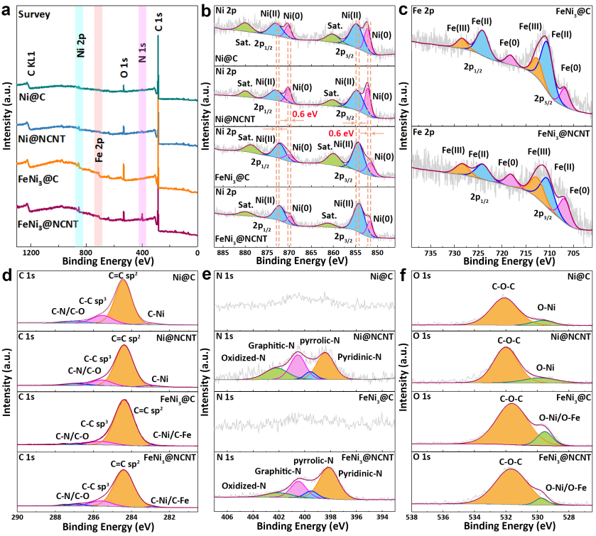 图5. Ni@C,Ni@NCNT,FeNi3@C和FeNi3@NCNT的(a)XPS全谱,(b-f)Ni 2p,Fe 2p,C 1s,N 1s,O 1s谱图。