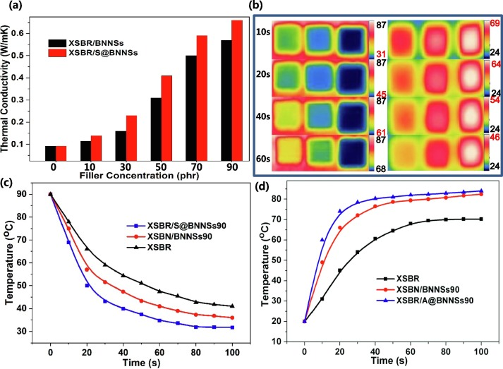 在本研究中,在超声条件下,吸附在氮化硼(BN)表面的离子液体分子使BN容易在咪唑的辅助下剥落成少层的氮化硼纳米片(BNNSs)。进一步合成了3-巯基丙基三甲氧基硅烷(MPTMS)接枝的BNNSs (S@BNNSs),并采用简易的乳胶复合法将其共混到橡胶基体中,最终制备了一种柔性热界面材料(TIM)。本课题系统研究了复合材料的界面之间的相互作用,及其对复合材料导热和机械性能的影响。实际应用测试证明其具有良好的散热潜力。