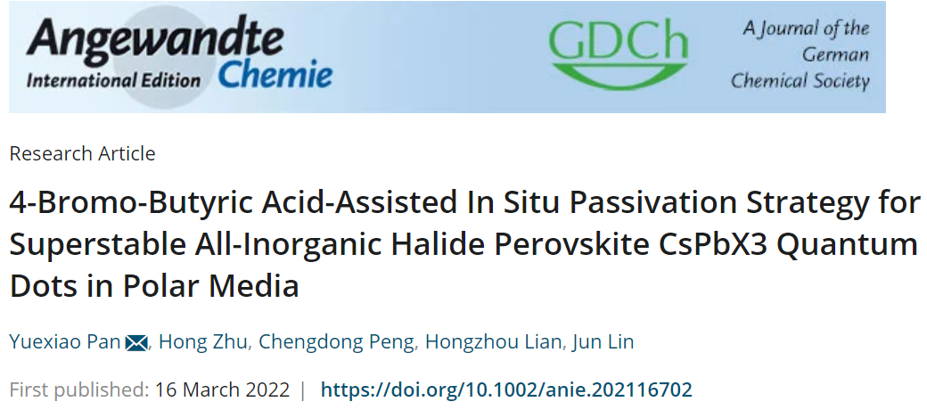 Yuexiao Pan, Hong Zhu, Chengdong Peng, Hongzhou Lian, Jun Lin, 4-Bromo-Butyric Acid-Assisted In Situ Passivation Strategy for Superstable All-Inorganic Halide Perovskite CsPbX3 Quantum Dots in Polar Media, Angew. Chem. Int. Ed. 2022
