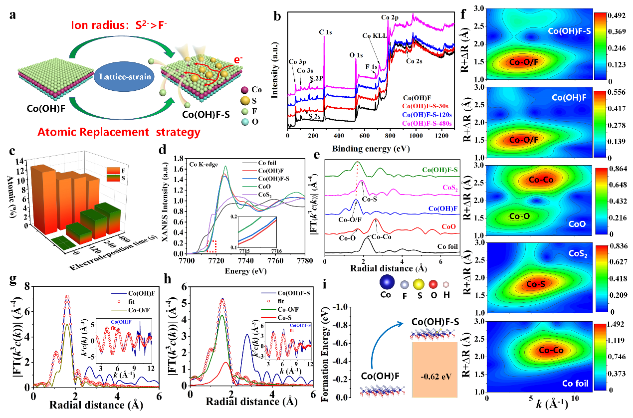 为了验证半径较大的硫原子可以取代半径较小的氟原子,作者首先通过非原位XPS证明随着引入硫原子的增加氟原子相对减少;随后,通过同步辐射证明硫原子的引入能够改变Co原子配位环境的变化;最后,通过计算相应结合能的方法验证了硫原子可以取代Co(OH)F中较小的氟原子。