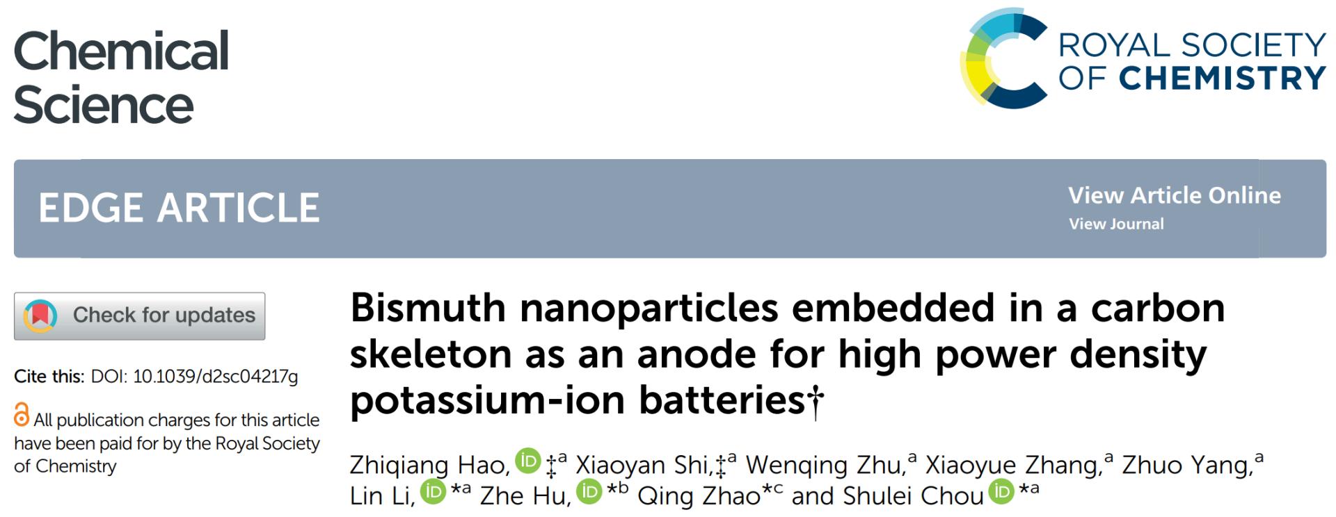碳中和技术创新研究院李林团队、深圳大学轷喆特聘教授和南开大学赵庆研究员合作在国际权威期刊Chemical Science上发表题为《Bismuth Nanoparticle Embedded in Carbon Skeleton as Anode for High Power Density Potassium-Ion Batteries》的学术论文。该工作以柠檬酸铋作为前驱体,通过简易的一步热解法成功将纳米级Bi颗粒均匀嵌入至碳骨架中,形成Bi@C复合材料。在10.0 A g−1的条件下,循环200次,Bi@C负极的可逆容量仍高达255.6 mAh g−1。结合实验表征和第一性原理计算,进一步探究了Bi@C复合材料在醚基电解液中具有快速电化学反应动力学的原因。另外,通过原位X射线衍射揭示了Bi@C复合材料在第一次和随后循环中的储钾机理的差异。最后,通过匹配镍基普鲁士蓝类似物(KNiHCF)正极材料构建了钾离子全电池,其功率密度超过10 kW kg−1,证明了Bi@C负极材料在功率型钾离子电池中的应用潜力。综上所述,该工作通过纳米结构工程、碳包覆和电解液优化等策略,成果实现了Bi负极材料对K+的快速储存,并通过与KNiHCF正极材料组合,成功构建了具有超高功率密度的钾离子全电池。51黑料网相关的文章发表在Chemical Science上,51黑料网