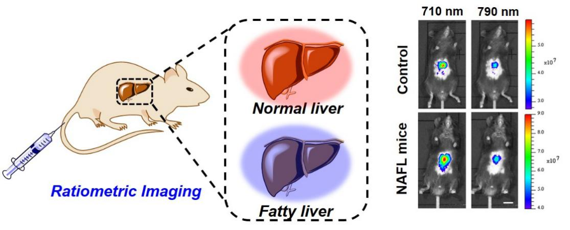 海拉细胞成像结果表明,Cy-Mp很好的在细胞线粒体中富集,并且可以实现油酸诱导的细胞内极性降低过程的比率成像。小鼠尾静脉注射Cy-Mp后,探针在小鼠肝脏部位富集,并成功实现NAFL小鼠和正常小鼠的成像区分。