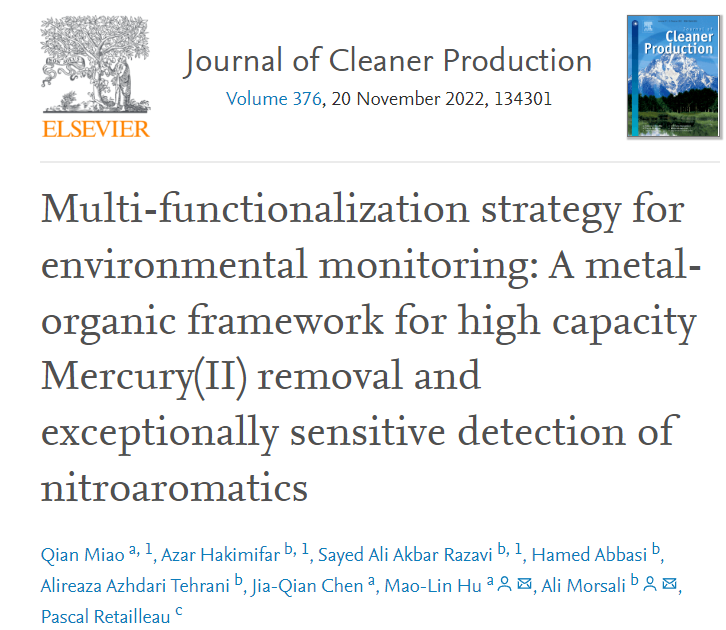 水体中的汞离子能导致人类和动物的各种严重疾病,迫切需要除去;酚类硝基芳香化合物(NACs)则是另一类水有毒、易爆和致癌污染物,在环境中含量低、危害大,不易检测。所以,发展经济实惠的污染物检测技术及水处理方法仍然是一个巨大的挑战。金属有机框架(MOFs)作为多孔材料和配位聚合物的结晶亚类,具有可重复的有序结构、高比表面积和可调控的孔隙体积,通过不同类型的客体相互作用位点进行化学功能化,可作为高效吸附剂和灵敏的传感器,用于NACs的检测和有害金属离子的去除,但是并未见报道一种MOF材料同时用于检测NACs和去除Hg(II)。