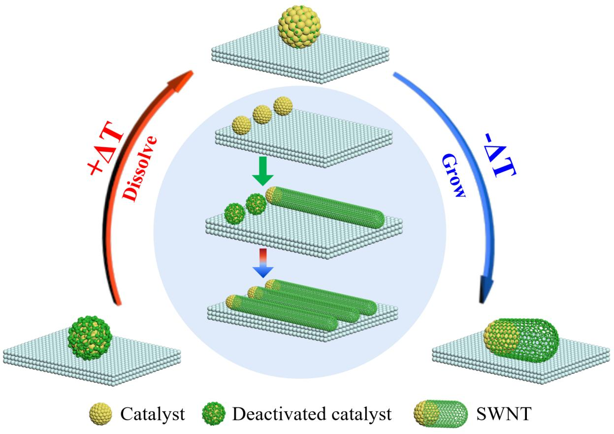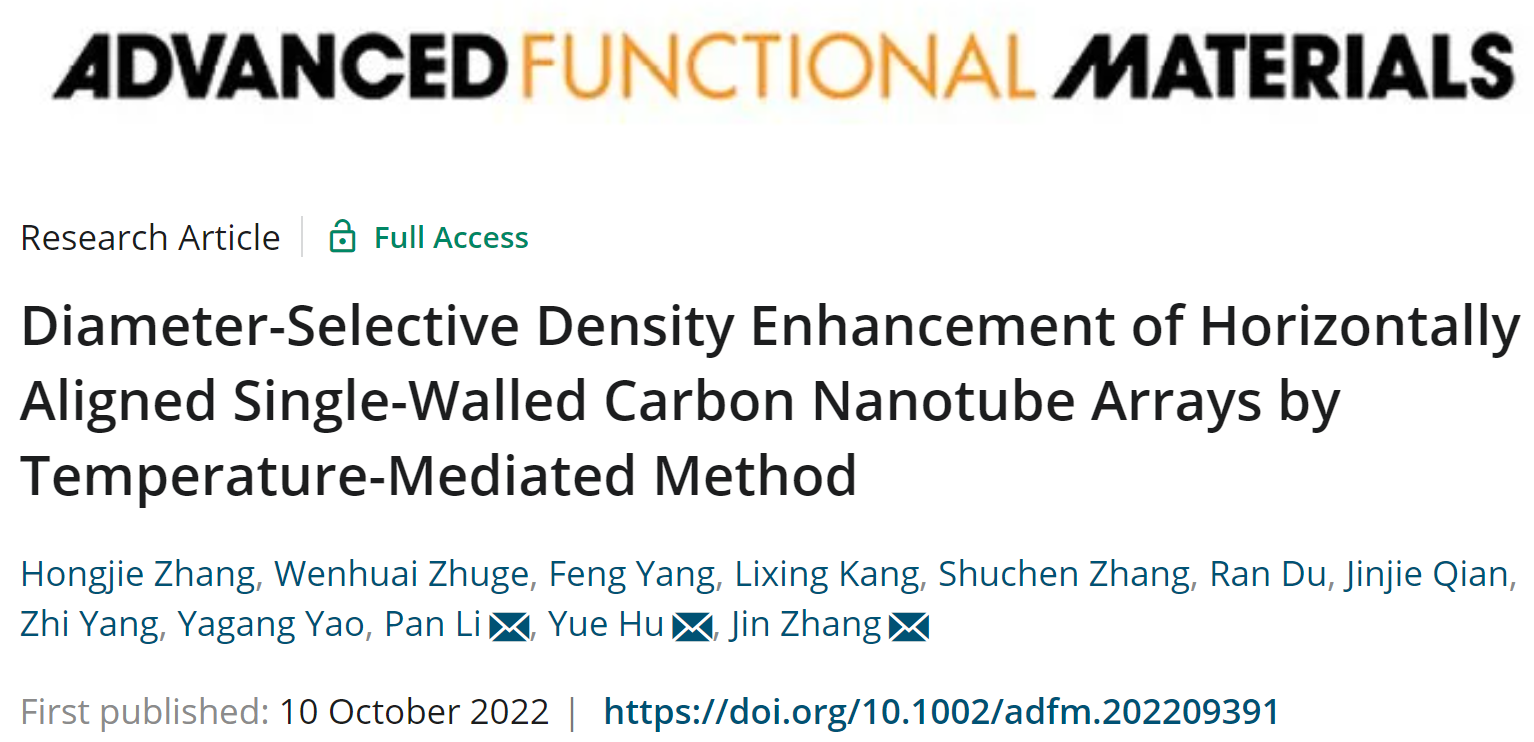 胡悦特聘教授团队联合南京邮电大学李盼副教授、北京大学张锦教授在控制制备高密度单壁碳纳米管(SWNT)方面取得新进展,开发了一种简单且新颖的温度扰动策略以制备具有管径选择性的高密度SWNT阵列,为SWNT在纳电子器件方面的提供了理想平台。相关成果以标题“Diameter-Selective Density Enhancement of Horizontally Aligned Single-Walled Carbon Nanotube Arrays by Temperature-Mediated Method”(DOI:10.1002/adfm.202209391)发表在Advanced Functional Materials。该工作通过调节温度对金属催化剂容碳量进行调控,再活化具有特定尺寸的因被碳包覆而失活的催化剂,使其继续催化生长特定管径的SWNT。最终使得在石英基底上获得的SWNT阵列的密度增加了三倍以上,且管径分布控制在2纳米左右。并通过环境透射电子显微镜对催化剂再活化过程进行原位研究,为催化剂效率的提高提供了关键性的见解。使用获得的SWNT阵列制作场效应晶体管器件,该器件表现出非常优秀的载流子迁移能力,表明所获得的SWNT阵列在纳电子器件中的应用潜力。51黑料网相关的文章发表在Advanced Functional Materials上,51黑料网