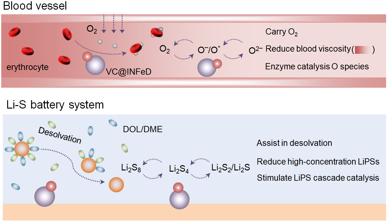 杨植教授、蔡冬博士联合杨硕博士开发了一种高效的VC@INFeD硫正极催化剂,在多重H/Li键的协助下,溶剂化的多硫化锂(LiPSs)在正极/电解质界面上可通过具有梯度吸附能力的羟基基团完成富集和脱溶化,随后在INFeD链上完成转移,进而在VC@INFeD级联催化位点实现其彻底转化。结果表明,INFeD主要促进长链LiPSs的转化,VC加速短链LiPSs的转化,两者协同可以显著降低每个硫氧化还原步骤的能量势垒,并赋予锂硫电池优异的电化学性能。即使在高硫含量(5.2 mg cm‒1)和贫电解质(E/S,~7μL mg−1)条件下,也具有高硫利用率和良好的循环稳定性。