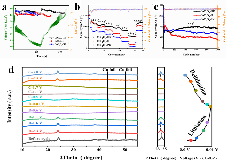 1. 通过柠檬酸钾辅助水热合成了高结晶性的CoC2O4-HK颗粒,它能提供稳定的骨架和长程有序的原子分布来促进Li+的快速传输和插层赝电容行为。通过非原位的XRD和XPS等发现CoC2O4在快速充放电过程中同时具有插层赝电容行为和可逆转化反应CoC2O4+2Li++2e-→Co+Li2C2O4,其中插层赝电容在CoC2O4的储锂过程中占了主导地位。