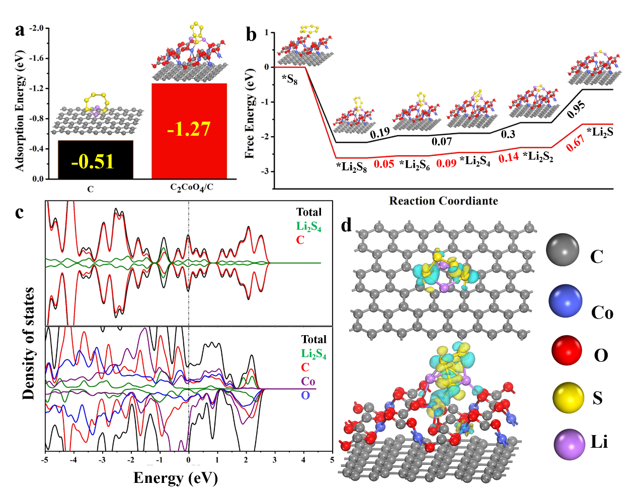 4. DFT理论计算表明在C/S复合材料中加入CoC2O4-HK,不仅可以促进电子转移和C/CoC2O4阴极上反应中间体的吸附-激活,而且可以加速多硫化物的催化转化,从而明显提高Li-S电池的反应动力学。