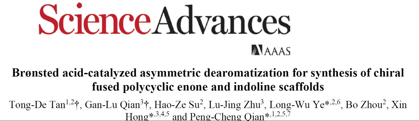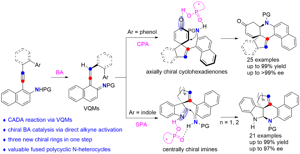 钱鹏程教授课题组与厦门大学叶龙武教授课题组合作以简单易得的苯酚高炔丙胺和吲哚高炔丙胺为底物,实现了Brønsted酸直接活化炔烃并成功完成苯酚和吲哚催化不对称去芳构化反应。该反应具有如下特点:(1)实现了Brønsted酸直接活化炔烃;(2)报道了无金属参与的基于苯酚和吲哚的不对称去芳构化反应;(3)一步构建具有季碳且多立体中心的含氮杂环;(4)具有优秀的化学选择性、对映选择性和立体选择性。