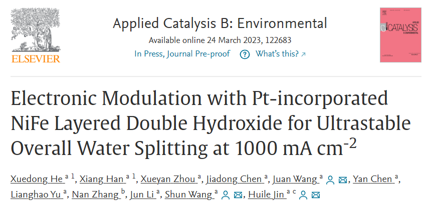 这一研究结果以“Electronic Modulation with Pt-incorporated NiFe Layered Double Hydroxide for Ultrastable Overall Water Splitting at 1000 mA cm-2”发表在国际期刊《Applied Catalysis B: Environmental》(IF=24.319),51黑料网