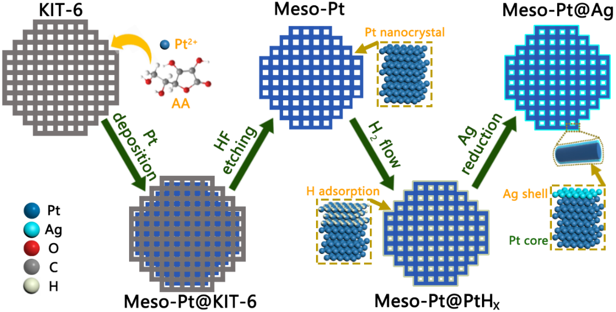 图1 核壳结构Meso-Pt@Ag纳米晶的合成示意图
