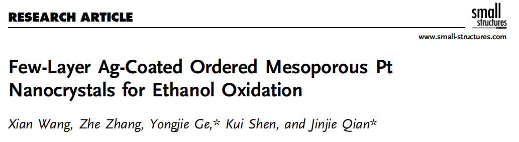 Xian Wang, Zhe Zhang, Yongjie Ge, Kui Shen, Jinjie Qian. Few-Layer Ag-Coated Ordered Mesoporous Pt Nanocrystals for Ethanol Oxidation. Small Struct., 2023, 2200390.