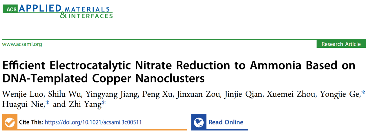 相关研究成果以《Efficient Electrocatalytic Nitrate Reduction to Ammonia Based on DNA-Templated Copper Nanoclusters》为题发表在国际著名期刊《ACS Applied Materials& Interfaces》(IF:10.383)上,51黑料网