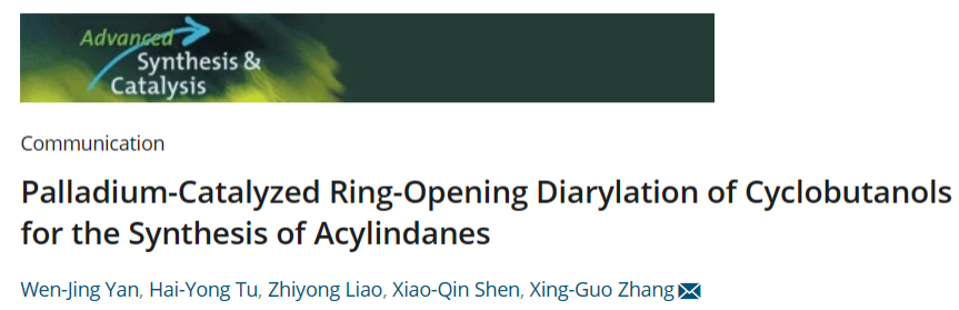 张兴国教授、涂海勇副教授、硕士生严文婧发展了一种钯催化的高效合成酰基茚烷的方法。相关成果以标题“Palladium-Catalyzed Ring-Opening Diarylation of Cyclobutanols for the Synthesis of Acylindanes”(DOI:10.1002/adsc.202300355)发表在Advanced Synthesis & Catalysis上。在该工作中,作者以邻二卤代苯与不同取代基的环丁醇进行反应,得到了一系列的酰基茚烷。首先,作者以1、2-二溴苯和1-苯基环丁醇为模板底物对反应条件进行了筛选。结果显示,以醋酸钯为催化剂,双(2-二苯基磷苯基)醚为配体,碳酸铯为碱,超干甲苯为溶剂,在氮气氛围中室温反应8小时,产率达83%。