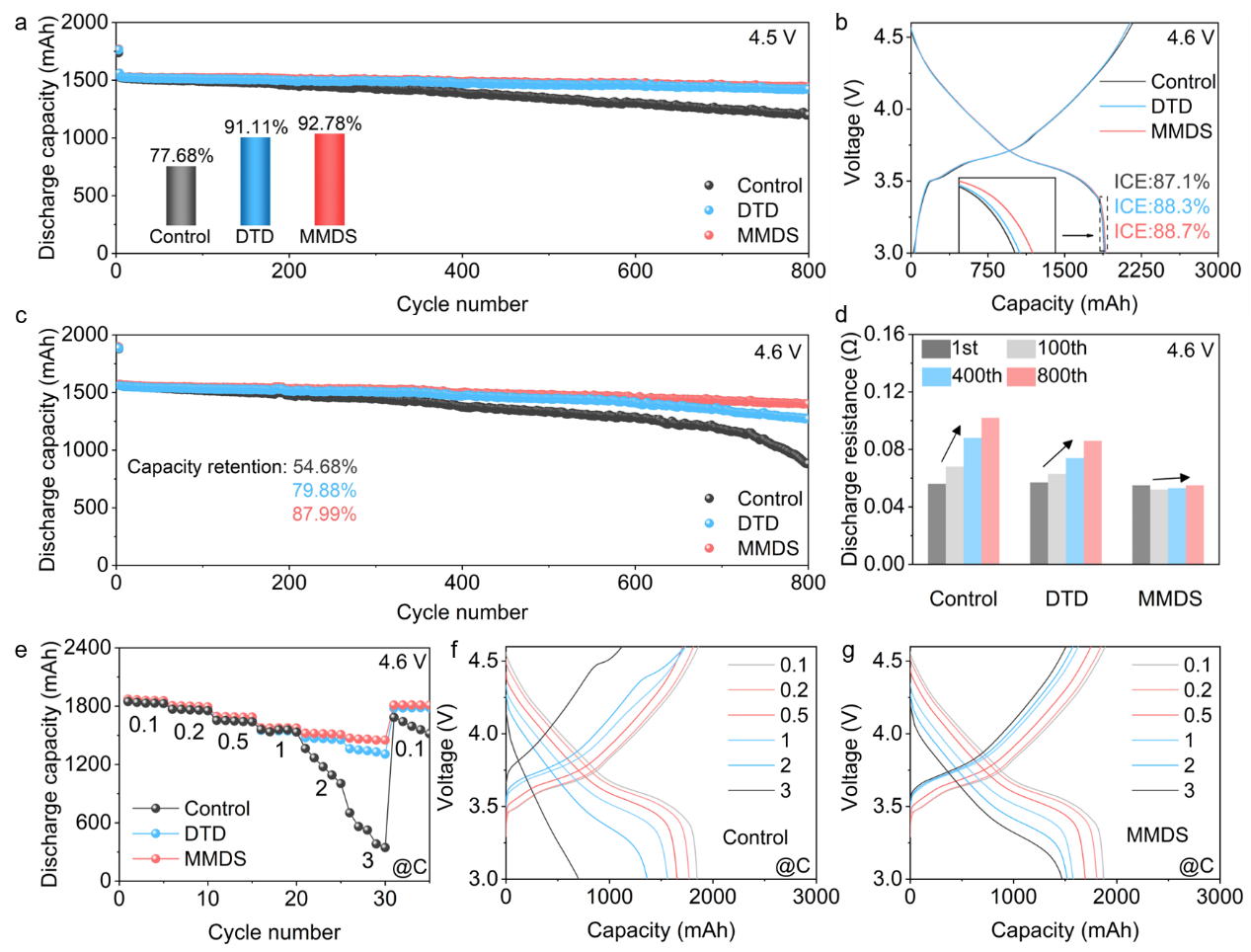 图1.甲烷二磺酸亚甲酯(MMDS)添加剂高电压电化学性能测试