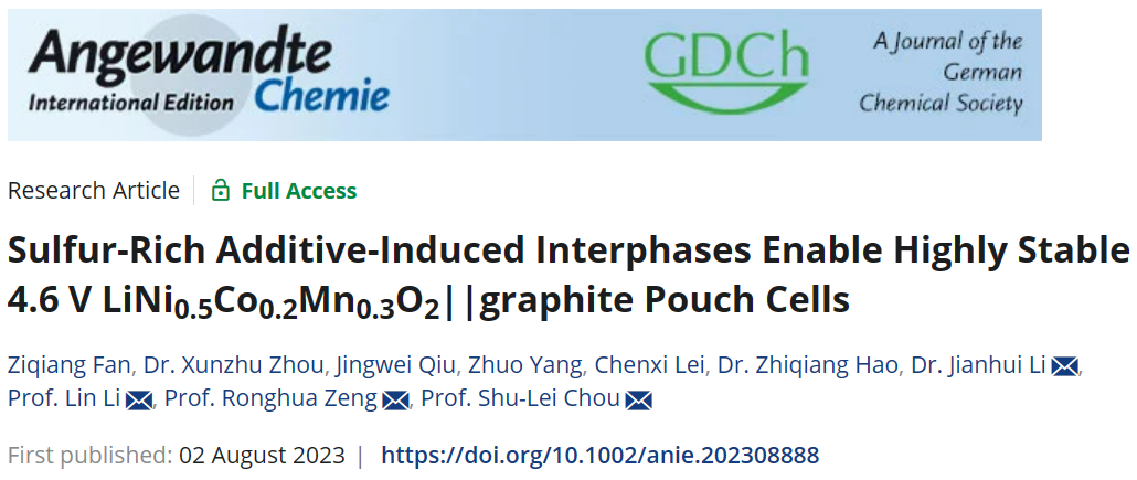 碳中和技术创新研究院李林团队联合华南师范大学曾荣华教授、李键辉博士在国际权威期刊Angewandte Chemie International Edition上发表题为《Sulfur-Rich Additive-Induced Interphases Enable Highly Stable 4.6 V LiNi0.5Co0.2Mn0.3O2||graphite Pouch Cells》的学术论文。本论文通过在4.6 V LiNi0.5Co0.2Mn0.3O2(NCM523)||石墨软包电池中引入含硫量为34.04%的超高含硫量添加剂(甲烷二磺酸亚甲酯,MMDS),从而构建了一种由添加剂诱导形成的稳固富硫电极-电解液面相。在4.6 V高电压条件下,循环800次,含MMDS添加剂的NCM523||石墨软包电池仍具有87.99%的高容量保持率以及更好的倍率性能,且与较低硫含量的一系列添加剂做对比,突出了高含硫量添加剂MMDS的优势。结合实验表征以及理论计算,进一步探究了MMDS添加剂在溶剂中的优先氧化还原性,从而证明它能够优先在正负极上界面构筑稳定的富硫电极-电解液界面膜,该界面相的存在成功稳定了高电压NCM523||石墨软包电池,显著提高了电池的循环稳定性。同时实验结果也表明MMDS分解所构筑的富硫界面相在抑制电解液消耗、产气以及稳定电极材料、减少过渡金属溶出上有着非常好的效果。51黑料网相关的文章发表在Angewandte Chemie International Edition上,51黑料网