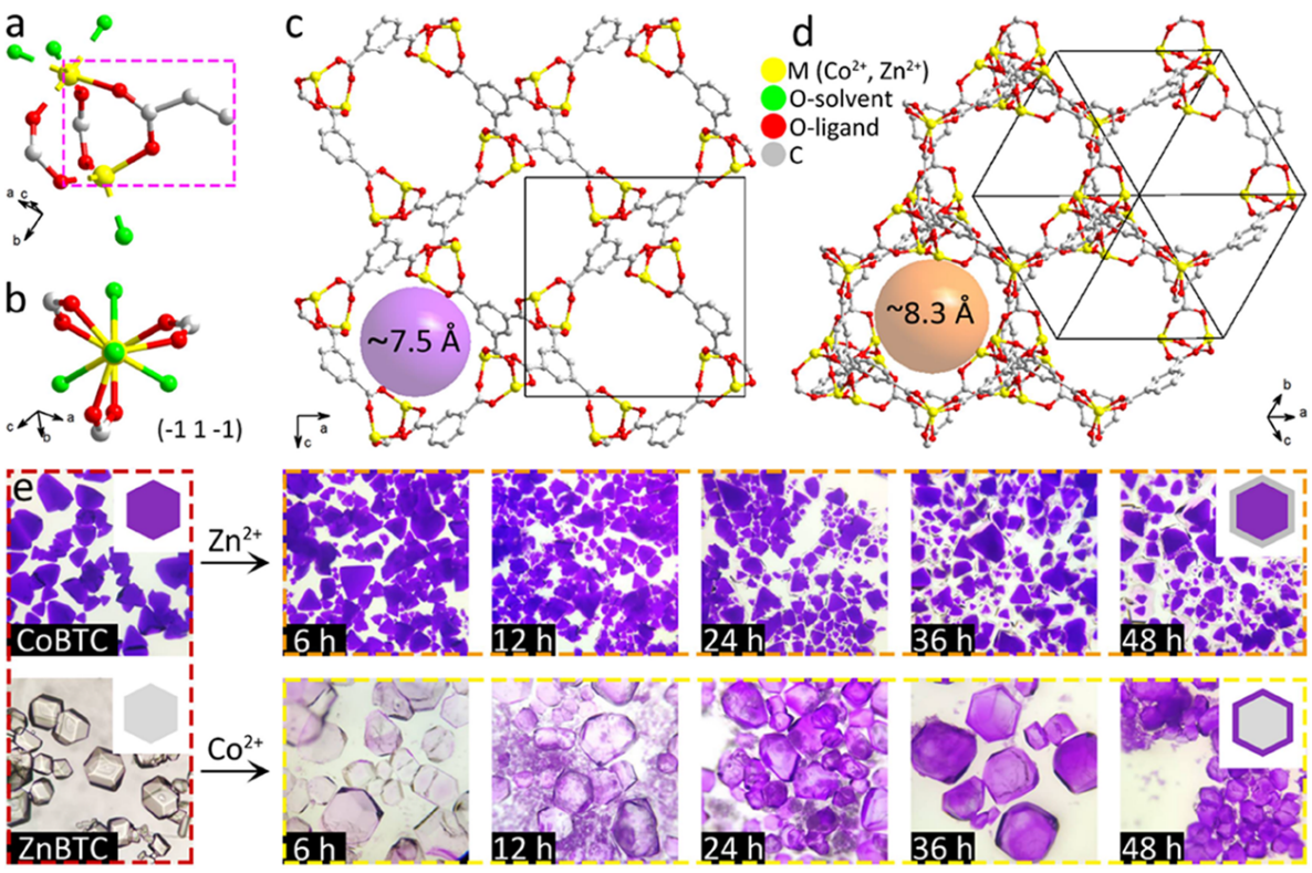 图1. MBTC的结构特征和Co/Zn基BTC的同质外延生长的转化过程光学照片。