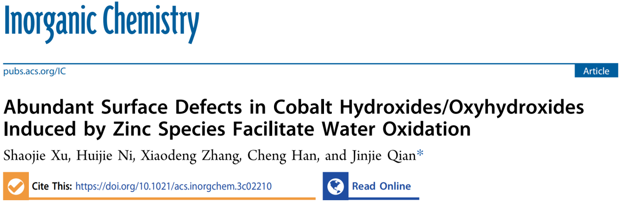 Shaojie Xu, Huijie Ni, Xiaodeng Zhang, Cheng Han, and Jinjie Qian*. Abundant surface defects in cobalt hydroxides/oxyhydroxides induced by zinc species facilitate water oxidation. Inorg. Chem. 10.1021/acs.inorgchem.3c02210 //doi.org/10.1021/acs.inorgchem.3c02210