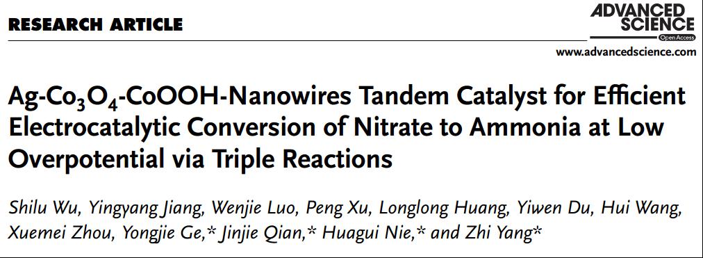 相关研究成果以《Ag-Co3O4-CoOOH-Nanowires Tandem Catalyst for Efficient Electrocatalytic Conversion of Nitrate to Ammonia at Low Overpotential via Triple Reactions》为题发表在国际著名期刊《Advanced Science》上,51黑料网