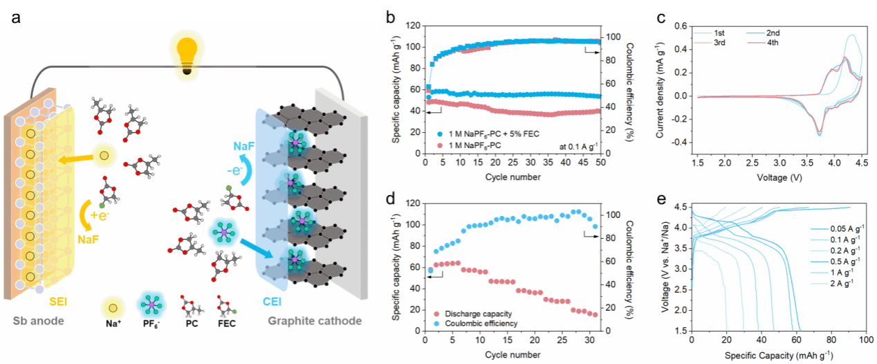 碳中和技术创新研究院李林团队联合南开大学赵庆教授以及澳大利亚伍仑贡大学赖伟鸿教授在国际权威期刊《Angewandte Chemie International Edition》上发表题为《Insight into the Role of Fluoroethylene Carbonate on the Stability of Sb||Graphite Dual-Ion Batteries in Propylene Carbonate-Based Electrolyte》的学术论文。本论文以锑(Sb)和石墨分别作为阳极和阴极,研究了含有氟代碳酸乙烯酯(FEC)添加剂的电解液中Na- DIBs的电化学性能。与不含FEC的电解液(1 M NaPF6-碳酸丙烯酯(PC))相比,作者发现加入FEC添加剂(5 wt.%)可促进阴极和阳极上富含NaF的无机电极电解质界面的形成,并改变PF6-阴离子的溶剂化行为。这种改性不仅有效抑制了NaPF6盐和PC溶剂的过度分解,还促进了PF6-阴离子在石墨阴极中的插层。制备的Sb||石墨全电池在50次循环后达到了58.5 mAh g-1的高放电比容量,容量保留率为93.1%(而传统电解质分别为48.3 mAh g-1和79.7%)。此外,在功率密度为157.78 W kg-1时,电池的能量密度为194.95 Wh kg-1(基于正极和负极的活性材料的质量)。本工作阐明了双功能FEC的潜在机制,并为构建高性能双离子电池提供了一种替代策略,促进了他们在未来可持续储能系统中的实际应用。