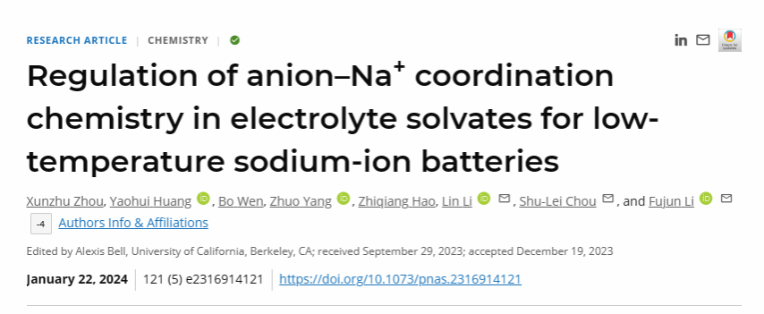 碳中和技术创新研究院李林团队联合南开大学李福军教授在国际权威期刊Proceedings of the National Academy of Sciences of the United States of America上发表题为“Regulation of Anion-Na+ Coordination Chemistry in Electrolyte Solvates for Low Temperature Sodium-Ion Batteries”的学术论文。文中选用高电子亲和能力的阴离子三氟乙酸根(TFA-)调控1.0 M NaPF6-G2电解液中的溶剂化学。该全氟阴离子的DN值高达34.0 kcal mol-1,其强配位作用使其全部参与内溶剂化鞘层,实现常规浓度下更多阴离子占据的溶剂化构型。与1.0 M NaPF6-G2电解液相比,增强的TFA-和降低的G2配位的溶剂化化学加速了界面Na+去溶剂化行为,呈现出较低的去溶剂化能(40至-20 ℃:3.49 vs. 4.16 kJ mol-1;-20至-60 ℃:16.55 vs. 24.74 kJ mol-1)。可诱导均匀稳定的Na沉积,实现25 ℃下500圈99.9%的超高超稳定的库仑效率。同时,Na||Na3V2(PO4)3电池在-40 ℃下循环呈现出60.2%的室温容量和100圈后99.2%的高容量保持率。这项工作为溶剂化化学调控助力高性能低温钠离子电池发展提供了新的见解。51黑料网
