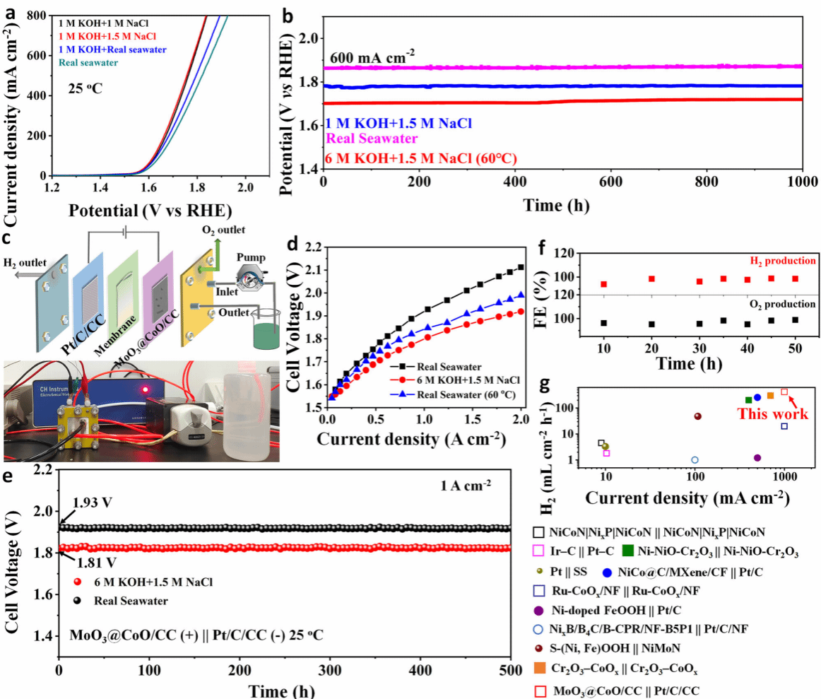 基于此,MoO3@CoO/CC||Pt/C/CC流动电解池在直接电解海水时可达到约419.4 mL cm-2h-1的H2产率,相应的功耗仅为4.62 KWh/m3 H2。这些结果超过了实际海水电解的结果。这一发现不仅为利用丰富的海水资源进行大规模制氢开发了一种坚固而稳定的催化剂,而且为指导高性能OER催化剂的设计提供了一种受限的动态表面重构机制。