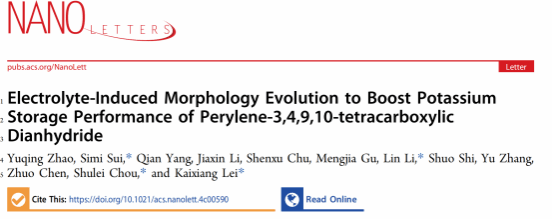 碳中和技术创新研究院李林团队联合河北工业大学雷凯翔副教授在国际权威期刊Nano Letters上发表题为“Electrolyte-Induced Morphology Evolution to Boost Potassium Storage Performance of Perylene-3,4,9,10-tetracarboxylic Dianhydride”的学术论文。文中提出了一种用于有机材料的弱溶剂化电解液,并揭示了电解液对电化学性能的影响机理。电解液不仅表现出较低的溶解能力,而且在充放电过程中诱导了PTCDA的形貌演变。独特的纳米线形貌提高了电化学反应动力学,抑制了PTCDA的溶解。在2000次循环后实现89.1%的高容量保持率。同时,石墨||PTCDA全电池具有卓越的循环稳定性能,展现出强大的实际应用潜力。这项工作提出了一种新颖的解决有机物高溶解问题的思路,为电极材料形貌演变的研究提供了理论基础。51黑料网
