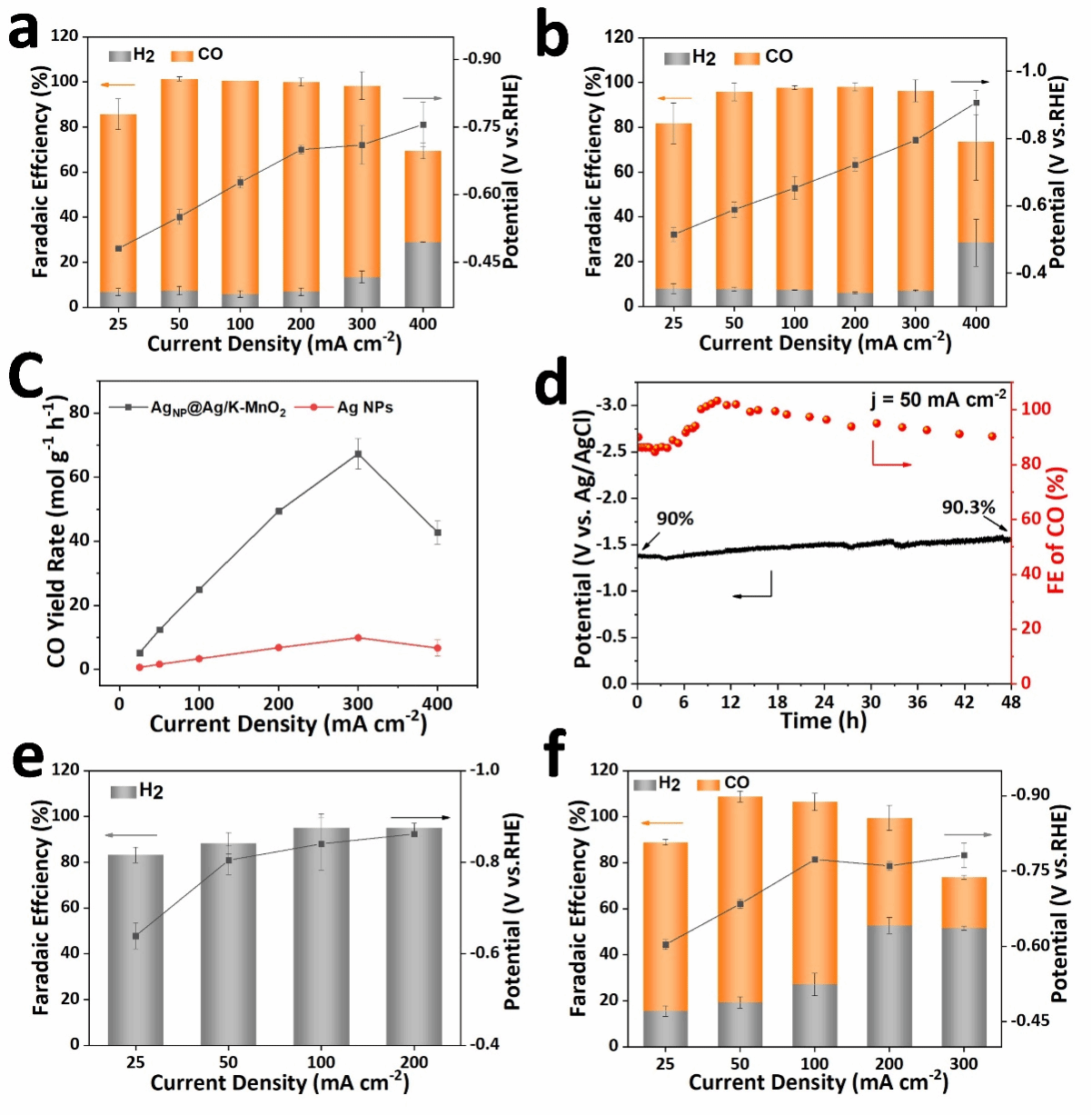 基于此,在碱性流动池中测试eCO2RR性能,AgNP@Ag/K-MnO2催化剂表现出高选择性(法拉第效率94%)、产率(67.3 mol/g/h)、部分电流密度270 mA/cm2和长期耐久性(在50 mA/cm2下约48小时),超过了商业Ag纳米颗粒(Ag NPs)和目前报道的大多数Ag电催化剂。本研究结果阐明了用于eCO2RR的先进催化剂的关键结构-性能关系。我们也期望它能够激发未来基于TMOs的催化剂的先进设计,考虑利用其内部晶格空间以最大程度地提高催化活性位点,而不是仅仅只局限在基底的表面位点。