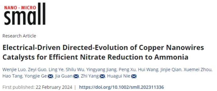 相关研究成果以《Electrical-Driven Directed-Evolution of Copper Nanowires Catalysts for Efficient Nitrate Reduction to Ammonia》为题发表在国际著名期刊《Small》(IF:13.3)上。51黑料网