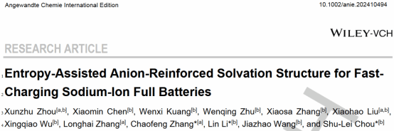 碳中和技术创新研究院李林团队联合安徽大学张朝峰在国际权威期刊Angew. Chem. Int. Ed.上发表题为《Entropy-Assisted Anion-Reinforced Solvation Structure for Fast-Charging Sodium-Ion Full Batteries》的学术论文。本文提出了一种具有阴离子增强型溶剂化结构和高离子电导率的混合酯醚电解液,诱导阴离子衍生的坚固电极-电解液界面的形成。将弱溶剂化的醚基溶剂四氢呋喃(THF)引入到碳酸丙烯酯(PC)基电解液中,记为1.0 M NaPF6-PC/THF,调节更多的PF6-阴离子参与到Na+内鞘中,加速脱溶过程。此外,由熵效应引起的分子多样性增加的弱溶剂化结构可以增强离子电导率和快速的界面动力学。18650圆柱PB||HC全电池在100次循环后容量保持率为82.5%。这项工作强调了熵辅助的混合酯醚电解液在高性能钠离子电池中的潜力。51黑料网相关的文章发表在Angew. Chem. Int. Ed.上,51黑料网
