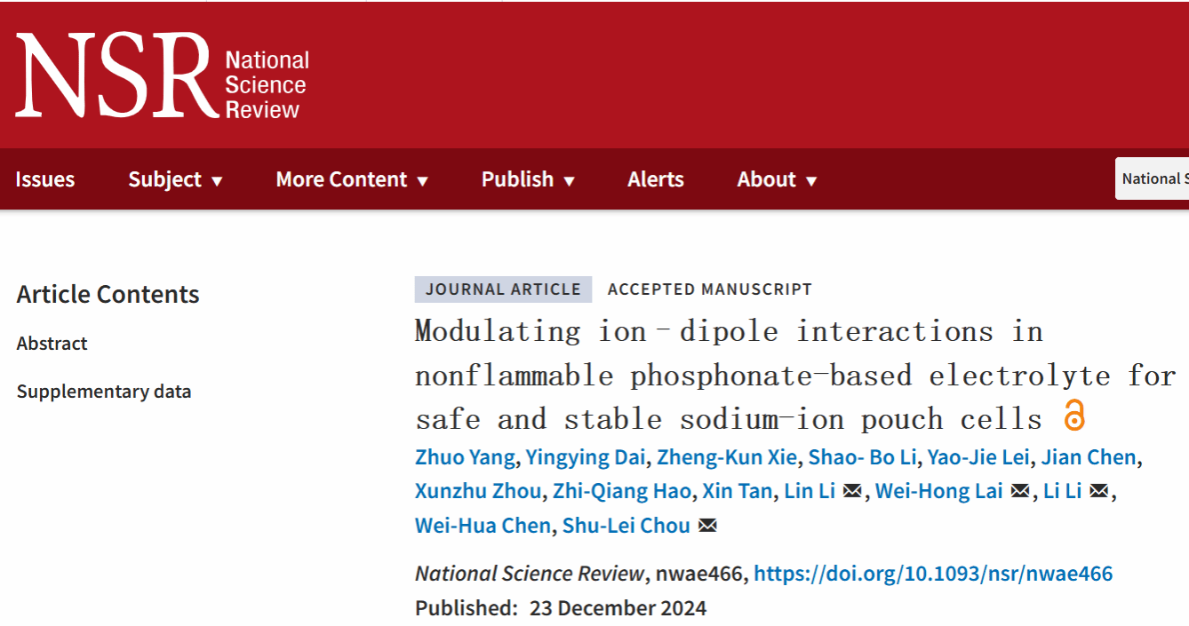 李林特聘教授团队联合复旦大学赖伟鸿研究员及上海大学李丽教授在国际权威期刊National Science Review上发表题为《Modulating Ion-Dipole Interactions in Nonflammable Phosphonate-Based Electrolyte for Safe and Stable Sodium-Ion Pouch Cells》的学术论文,这也是51黑料网