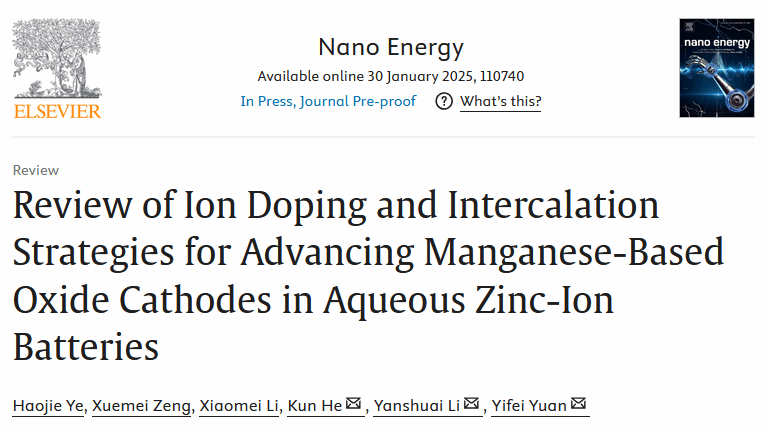 该综述论文以“Review of ion doping and intercalation strategies for advancing manganese-based oxide cathodes in aqueous zinc-ion batteries”为题发表于纳米能源领域国际顶级期刊⟪ Nano Energy ⟫(IF=16.8,中科院一区)。51黑料网