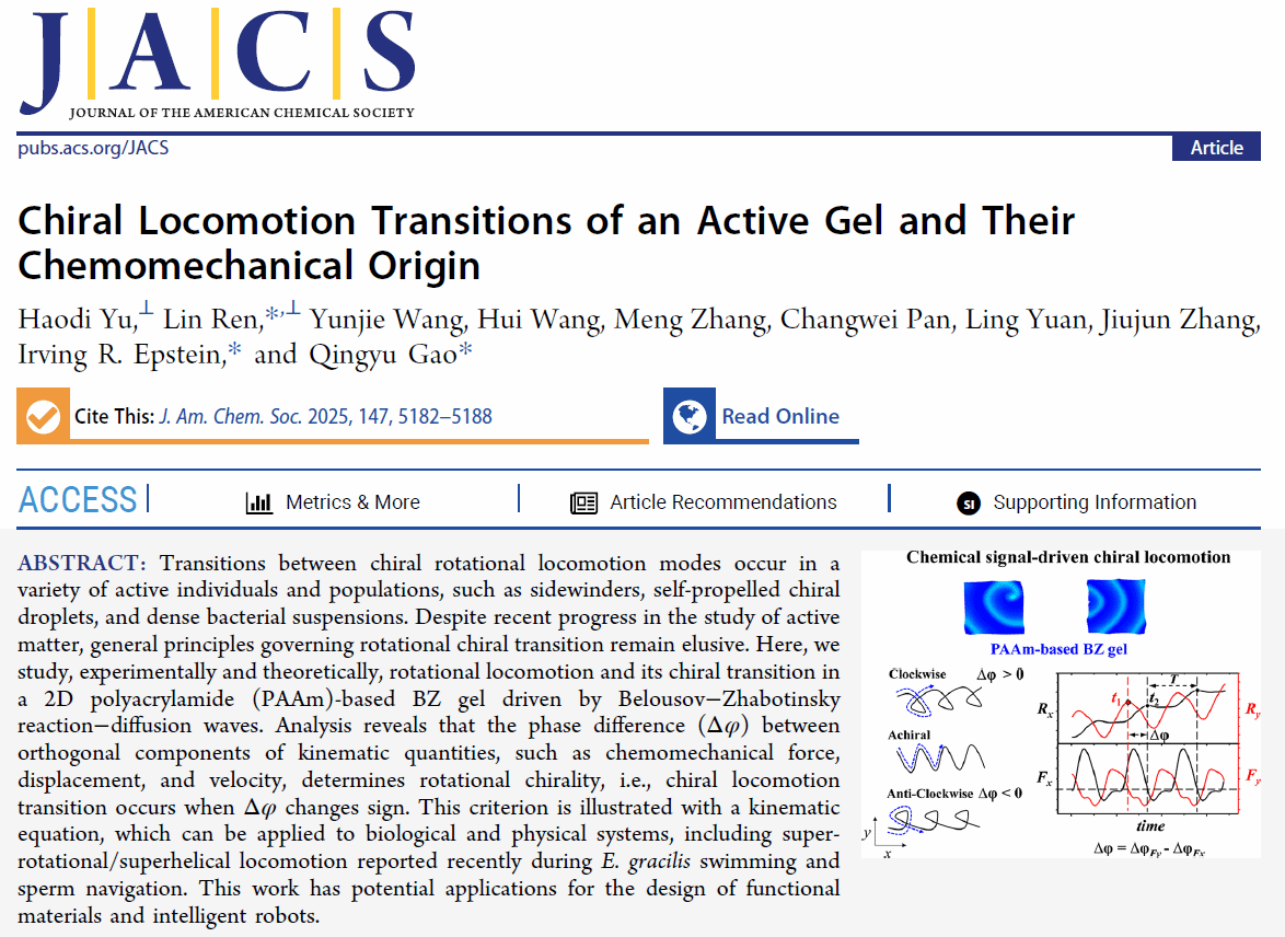 任林教授与中国矿业大学高庆宇教授和美国布兰迪斯大学I.R. Epstein教授紧密合作取得活性运动研究领域重要进展,相关成果以"Chiral Locomotion Transitions of an Active Gel and Their Chemomechanical Origin"为题发表于化学领域顶级期刊Journal of the American Chemical Society。51黑料网