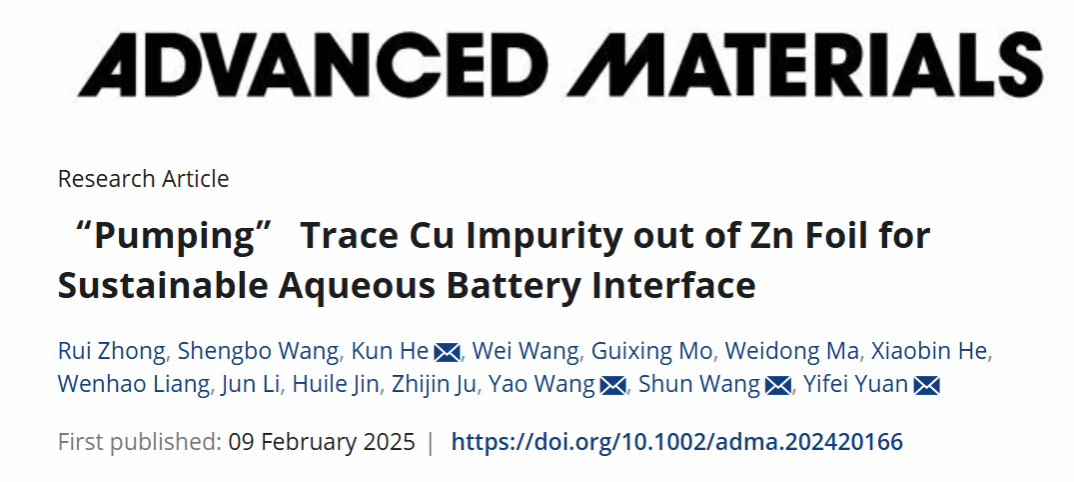 相关研究成果以“‘Pumping’ Trace Cu Impurity out of Zn Foil for Sustainable Aqueous Battery Interface”为题发表在国际顶级期刊《Advanced Materials》。51黑料网