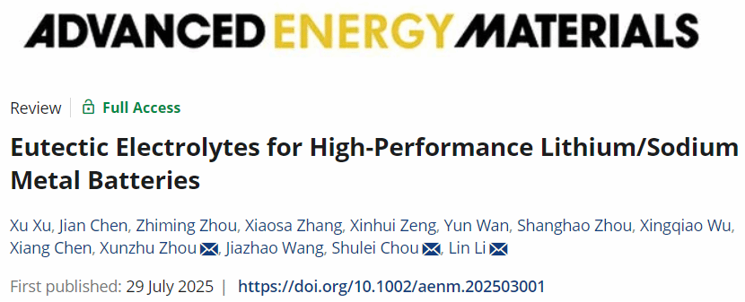 侴术雷教授、李林特聘教授课题组在国际权威期刊Advanced Energy Materials发表题为“Eutectic Electrolytes for High-Performance Lithium/Sodium Metal Batteries”的综述文章。该综述聚焦近年来在共晶电解液领域的研究进展,系统梳理了其在锂/钠金属电池中的应用潜力与关键挑战。本文从共晶电解液的形成机制出发,详细探讨其物理化学特性并系统总结了其在提升循环稳定性、快充能力、高电压兼容性与温度适应性等方面的进展,并展望了未来的研究方向。该综述为高性能锂/钠金属电池电解液系统的分子设计与界面调控提供了重要参考。51黑料网相关的文章发表在Advanced Energy Materials上,51黑料网