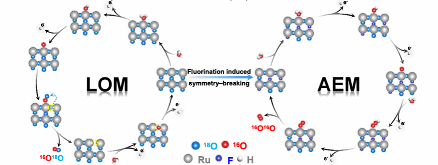 王娟/金辉乐/王舜团队在国际顶级期刊《Nature Communications》发表题为“Durable acidic water oxidation ruthenium based electrocatalyst by fluorination induced symmetry breaking”的论文。在这项工作中,通过DFT计算预测了一种高效酸性OER电催化剂,该催化剂通过F取代RuO2中部分O原子来打破八面体构型的对称性,从而实现反应路径的切换。其中,对氧物种吸附能力的改善和脱金属过程的削弱,显著提升了催化剂的OER本征活性和抗溶解能力。实验表明,在酸性条件下,F–RuO2/FC仅需192、243和296 mV过电位即可分别达到10、50和100 mA cm–2的电流密度。更重要的是,在PEMWE中,1.58、1.70、1.89和2.05 V的电压可分别驱动500、1000、2000和3000 mA cm–2的电流密度,并能在100、500及1000 mA cm–2的电流密度下持续稳定运行两个月。原位实验证实,F诱导的对称性破缺确保了RuO2在OER过程中的结构稳定性,并将其反应机制从传统的LOM转变为AEM,从而显著增强了稳定性。