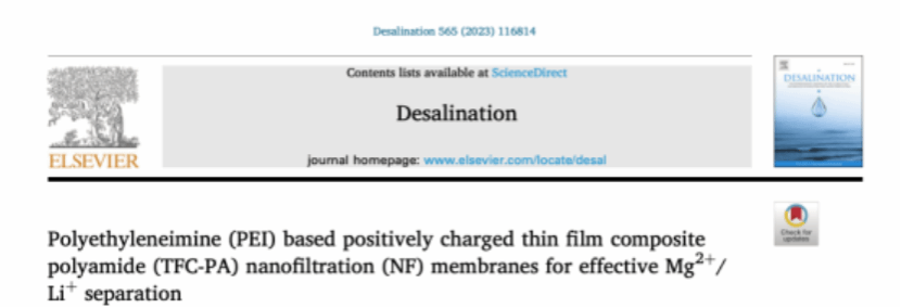 /浙江工业大学研究员薛立新,发表于国际顶刊《Desalination》的论文 “Polyethyleneimine (PEI) based positively charged thin film composite polyamide (TFC-PA) nanofiltration (NF) membranes for effective Mg²⁺/Li⁺ separation” ,荣获该期刊颁发的 “2023-2025年度最佳论文奖” (“Best Paper in Desalination 2023–2025”)。