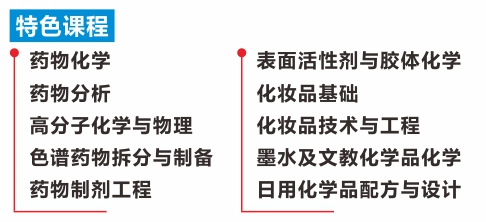 特色课程:药物化学、药物分析、色谱药物拆分与制备、表面活性剂与胶体化学、化妆品技术与工程、墨水及文教化学品化学等。