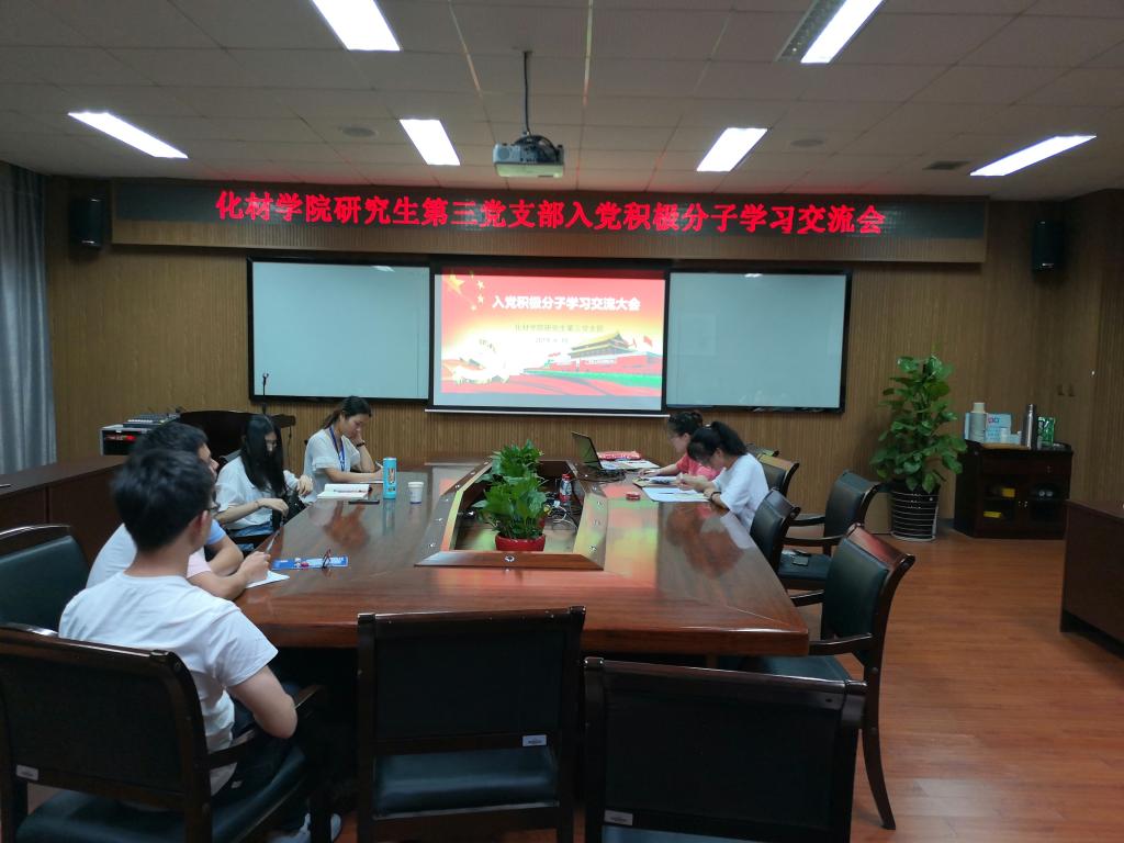研究生第三党支部在化材楼11B-204召开了2018-2019学年第二学期入党积极分子学习交流大会。本次会议由支部书记贾雅君同志主持,研究生第三党支部支委及全体入党积极分子参加了本次会议。