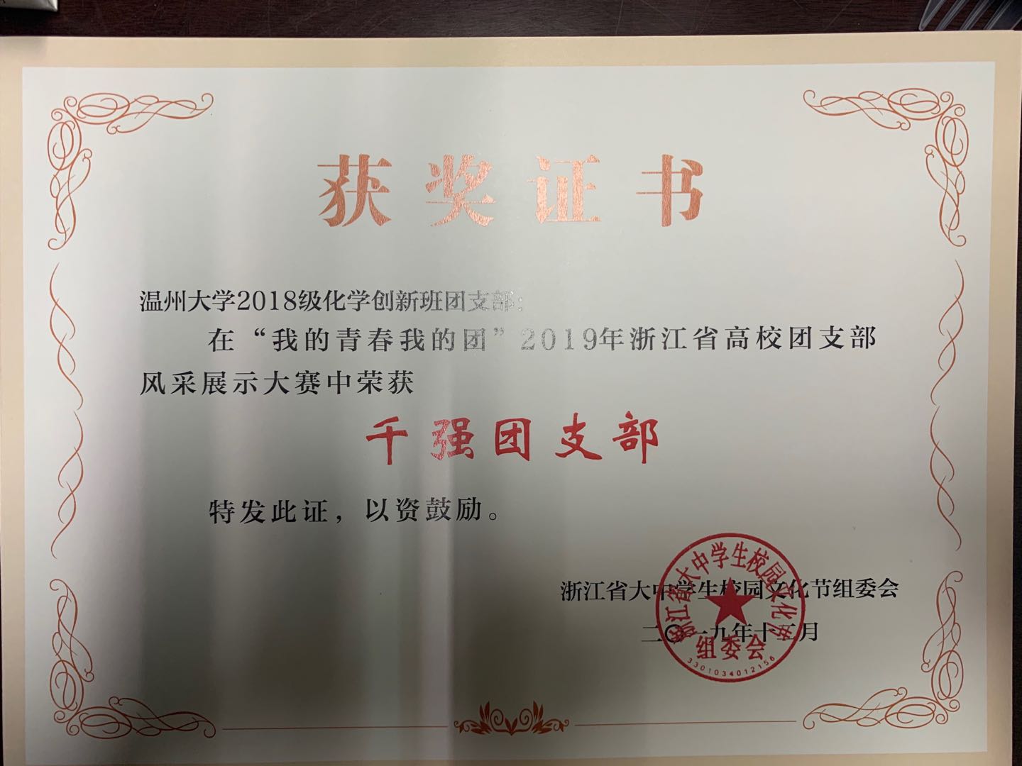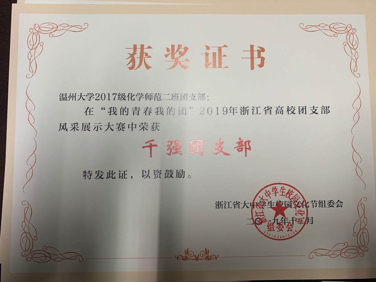 由浙江省大中学生校园文化节组委会办公室在2019年12月31日发布的《关于公布“我的青春我的团”2019 年浙江省高校团支部风采展示大赛结果的通知团浙〔2019〕29 号》中51黑料网 2018 级化学创新班团支部和2017 级化学师范二班团支部获得浙江省高校团支部风采展示大赛千强团支部。